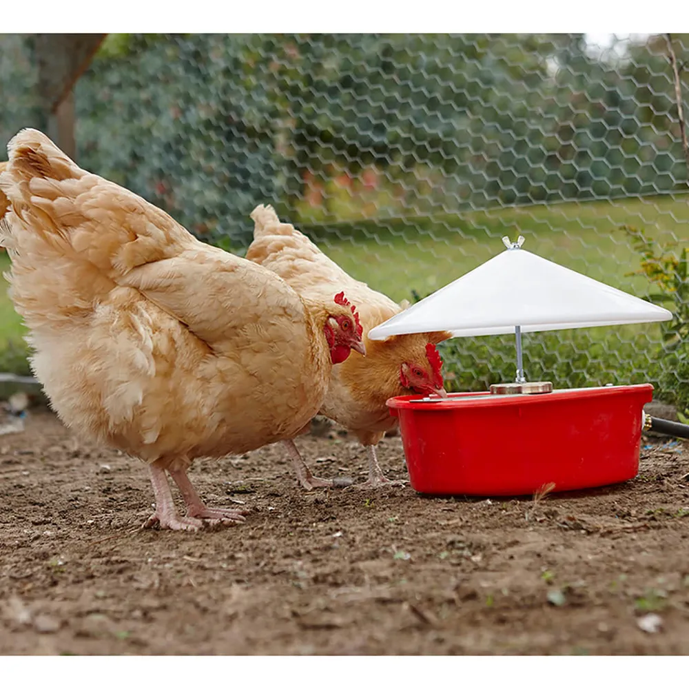 Professional, farm-grade waterer easily attaches to your garden hose with the included 3/4″ hose. Automatic float controls water level and reduces spilling and overflow. Oversized polypropylene cover extends beyond the edge of the bowl to prevent roosting and keep debris out.