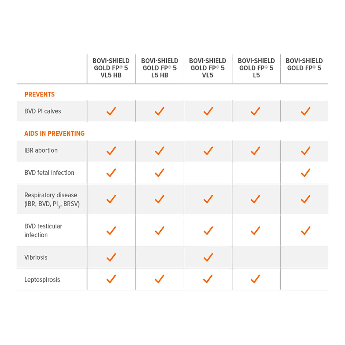 Dosage: 2 ml IM to all breeding cows and heifers about 1 month prior to breeding or being added to herd. Revaccinate with Vibrio/Lepto vaccine in 3-4 weeks. Revaccinate annually. Do not use Bovi-Shield GOLD FP 5 VL5 in pregnant cows or calves nursing pregnant cows, unless they were previously vaccinated as described above. 21 day slaughter withdrawal.