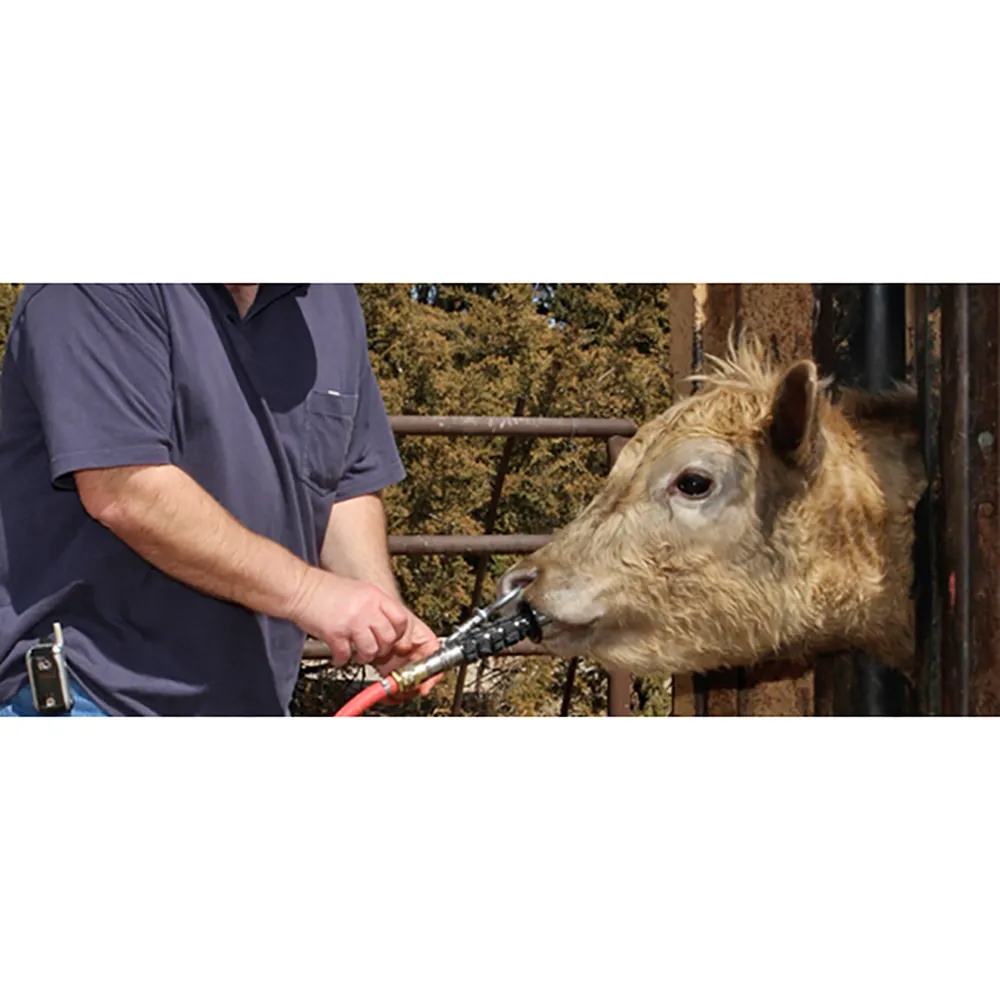 Includes nose lead, pump with hand grip, chrome-plated brass pump, 6′ x 1/2″ oil-resistant hose with screw-on brass fittings, stainless steel probe and canvas carrying case. 300 CPS size is designed for use on cattle 300-900 lbs; 500 CPS size for use on cattle 900+ lbs.
