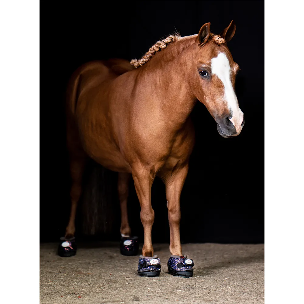 Heavy duty industrial grade 1680 Denier nylon upper. Soft foam collar. Supple and flexible bulb. Conforms to individual hoofs and pasterns. Replaceable Velcro closure system.