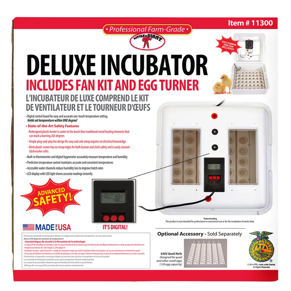 Made of durable styrofoam to retain warmth generated by a gentle heating element controlled by a highly dependable, digital control board. Built-in fan constantly circulates air to maintain a proper temperature throughout the incubator, eliminating harmful hot and cold spots. LCD display with LED light shows accurate temperature and humidity readings instantly. Self-regulating control board adjusts temperature to suit varying environments. Features built-in digital hydrometer and moisture channels to help maintain humidity, a key factor in egg health. Plastic mesh screen safely supports eggs during hatch period and is dishwasher safe. Two viewing windows allow for monitoring the hatching process.