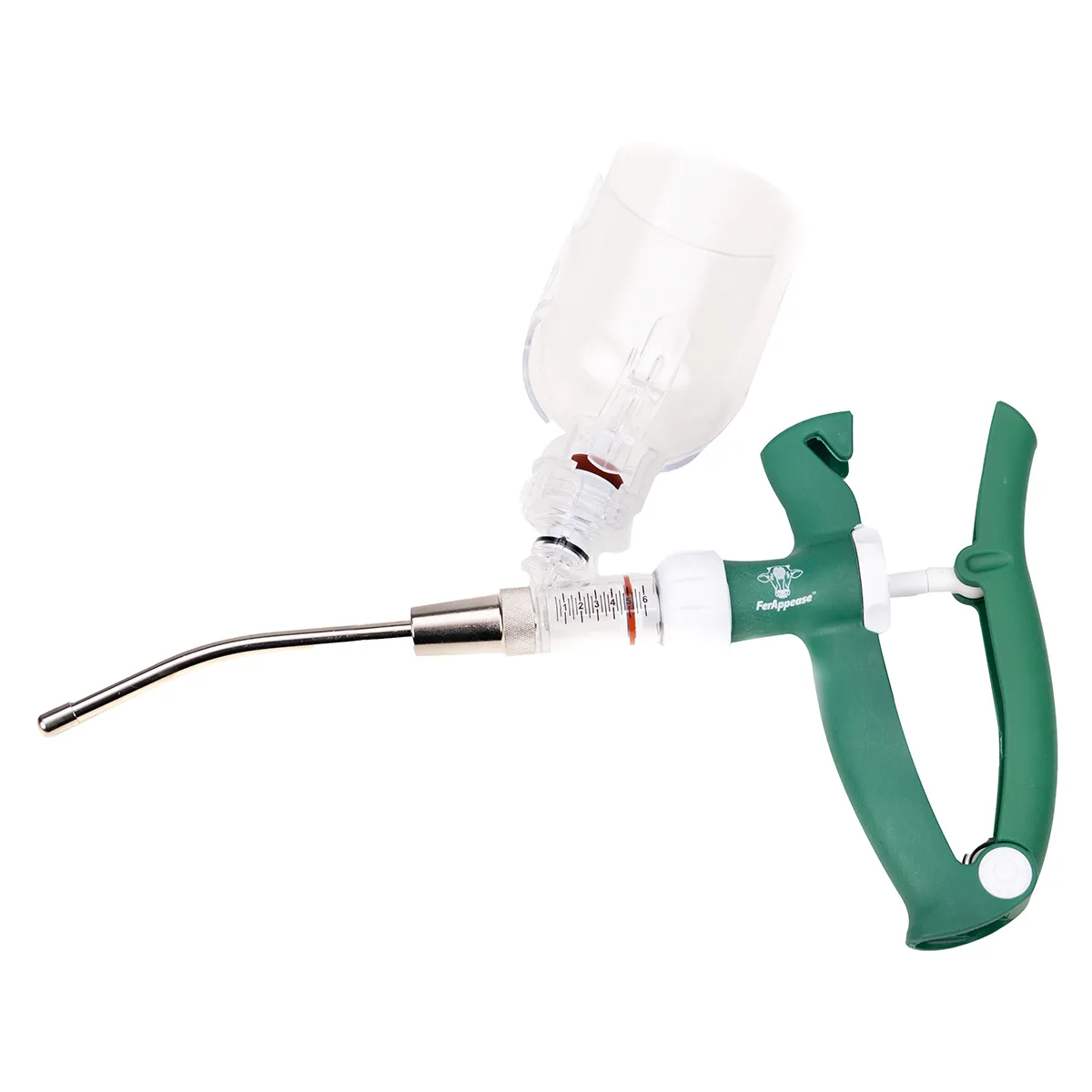 Easy-to-use dosing gun for use with FerAppease Maternal Bovine Appeasing Substance. Bottle inserting design with angled, stainless-steel nozzle for easy administration. Features accurate dose adjustment in 1 ml increments up to 6 ml.