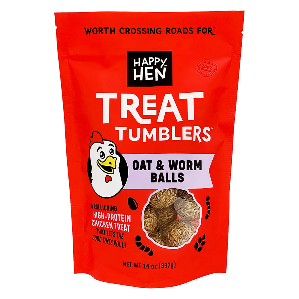 Premium mealworm treats in a ball for chickens. Handy feeding bag. Chickens will peck and play with treats.