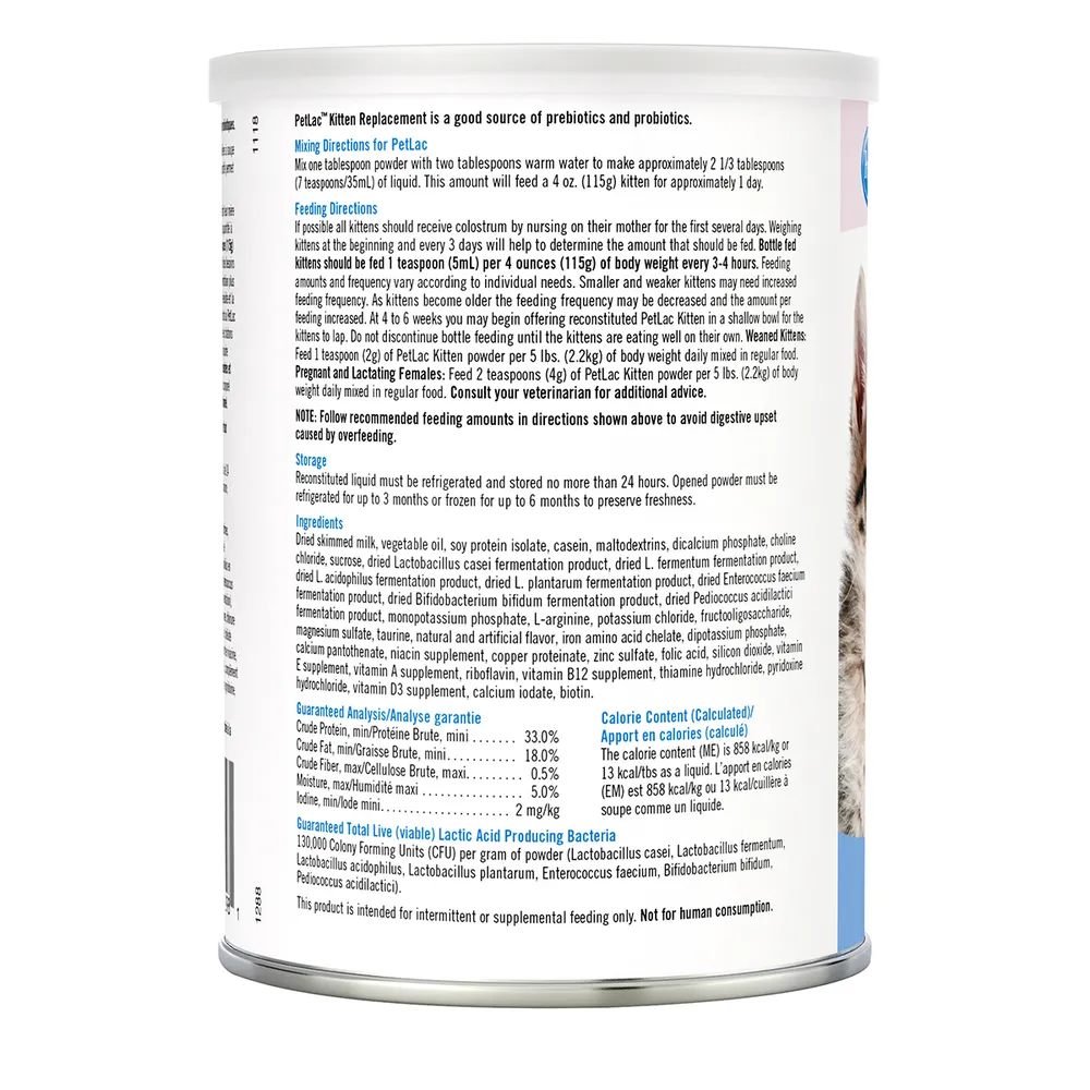 Powder directions: Bottle fed kittens – 1 tsp per 4 oz body weight every 3-4 hours.Weaned kittens – 1 tsp per 5 lbs body weight daily mixed in food.Pregnant and lactating females – 2 tsp per 5 lbs body weight daily mixed in food.Smaller and weaker kittens may need increased feeding frequency. As kittens become older, feeding frequency may be decreased and amount per feeding increased. May be offered in shallow bowl to lap beginning at 4-6 weeks. Do not discontinue feeding until kittens eat well on their own.