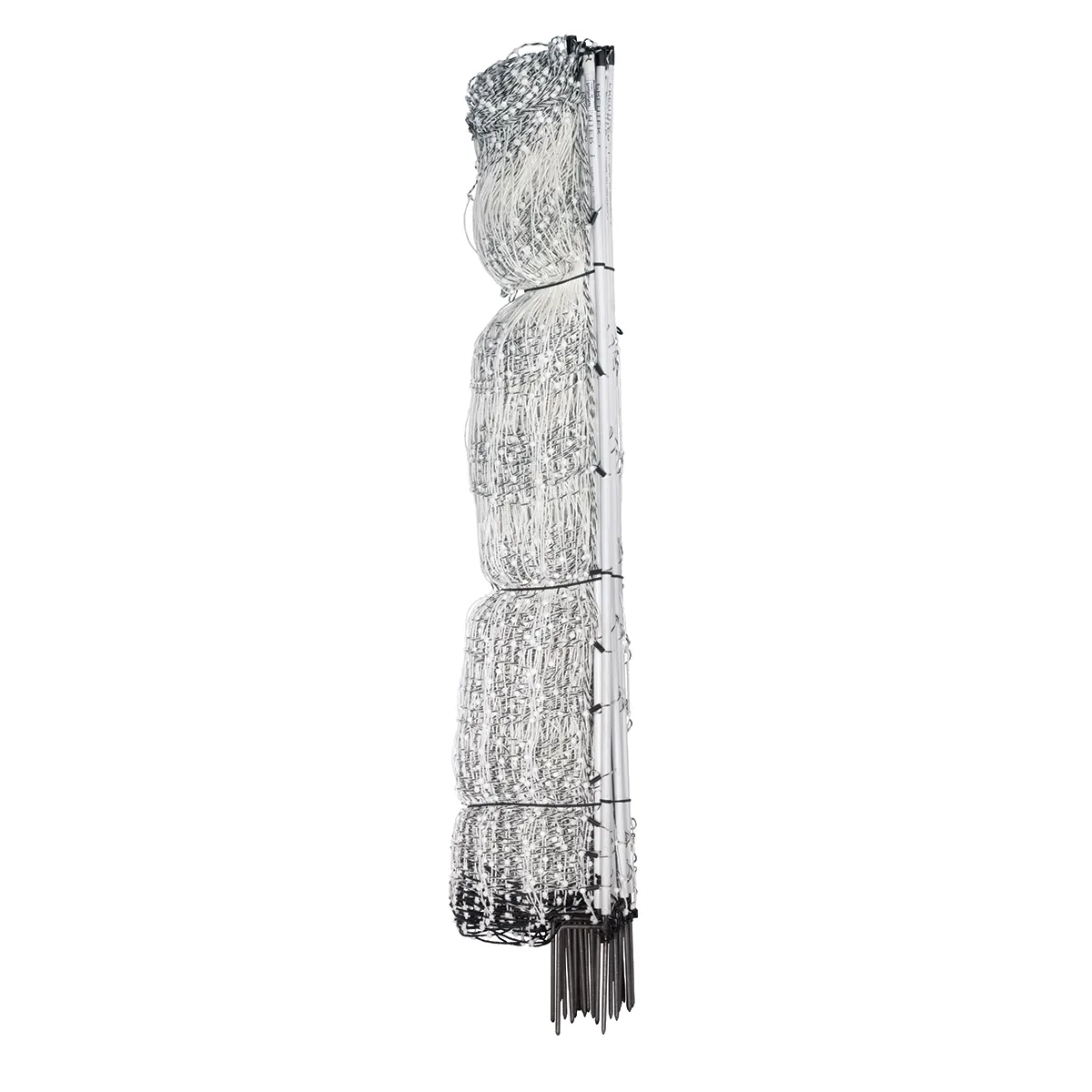 Roll length 164′; weighs only 24 lbs. White/Black. Comes with 1 warning sign and 1 repair kit. With proper care, netting should last 5-7 years. Fence energizer to electrify net sold separately.