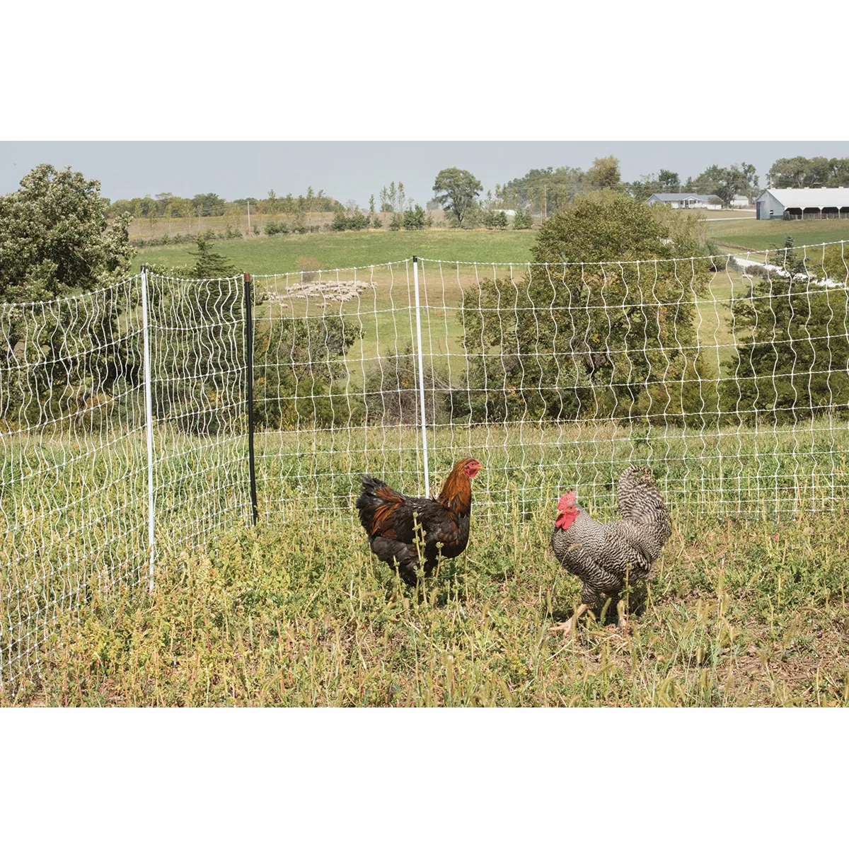 Prefabricated, preassembled portable electric fence with 12 horizontal strands (11 conductive), 48″ tall installed; string verticals every 3″. Built-in white PVC 0.6″ diameter line posts spaced every 10 feet. Keeps in chickens, ducks, geese and other poultry while discouraging and keeping ground-based predators like deer, bear, raccoons, rabbits, foxes, coyotes, stray dogs and skunks out. Recommended for active, flighty birds. Can be used to contain and control livestock other than poultry, like sheep, goats, cattle and guard dogs.