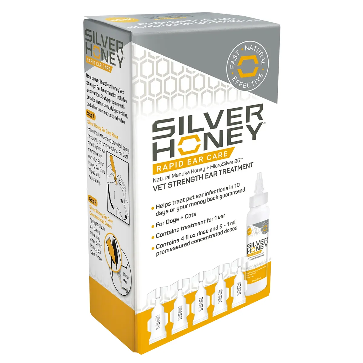 Directions: Step 1 – Use ear rinse once every day. Apply liberally in ear canal. Gently massage and work into area for 5 seconds. Allow pet to shake head so debris can leave ear. Wipe away debris before Step 2. Step 2 – Use concentrated treatment doses on days 1, 3, 5, 7 and 9 once daily. Twist cap off single dose and squeeze full amount into inner ear. Gently massage and work into area.