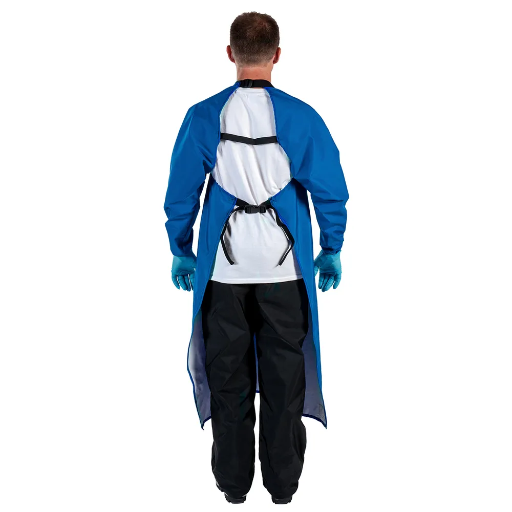 Waterproof nylon apron ideal for milking, washing down parlors, power washing equipment, calf feeding and herd checks. Features adjustable neck and waist straps. Blue.